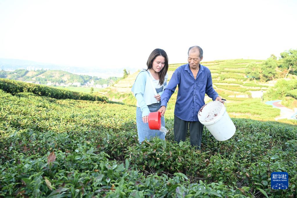 8月25日,植保技術服務人員林玲靚(左)在福鼎市點頭鎮江美村一處茶園指導茶農利用天然源生物激活劑等開展茶樹旱熱害修復處理。