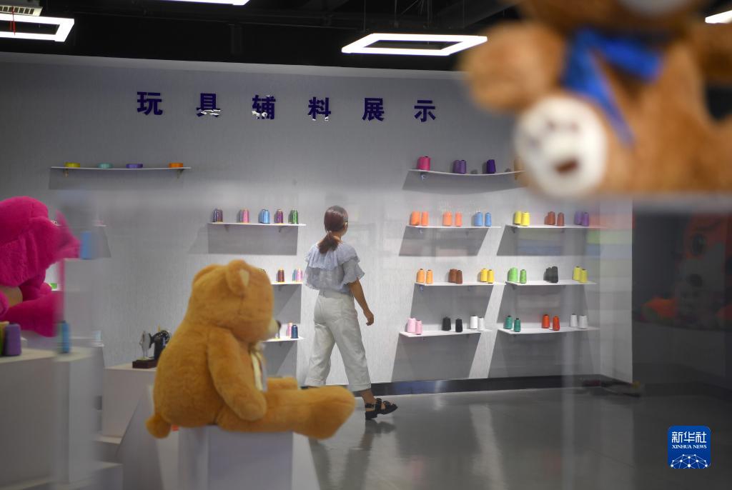 游客在參觀安康毛絨玩具文創產業五大中心內展示的毛絨玩具輔料(2022年8月18日攝)。