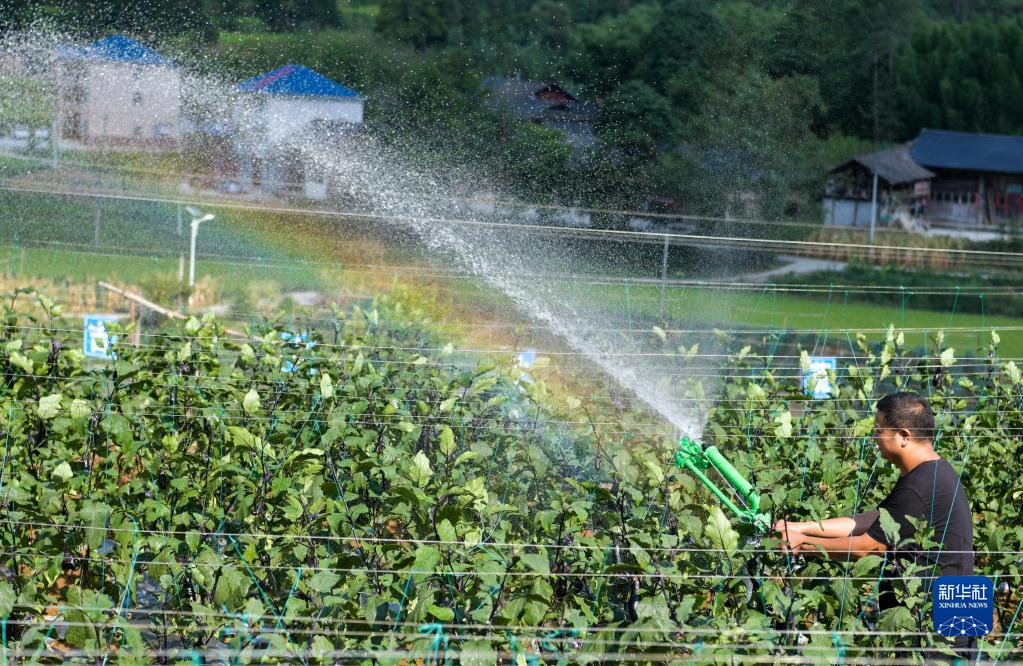 8月25日,在遵義市務川縣分水鎮中壩村,村干部在調節自動噴灌系統給蔬菜基地的茄子樹澆水。
