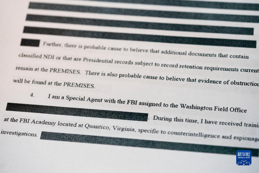 這是8月26日拍攝的美國聯邦調查局申請搜查前總統特朗普住所海湖莊園時向法院提交書面證詞的部分內容。