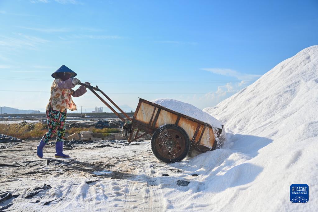 8月26日,在福建省莆田市秀嶼區東嶠鎮的莆田鹽場,工人把推車里的鹽運送至鹽山。