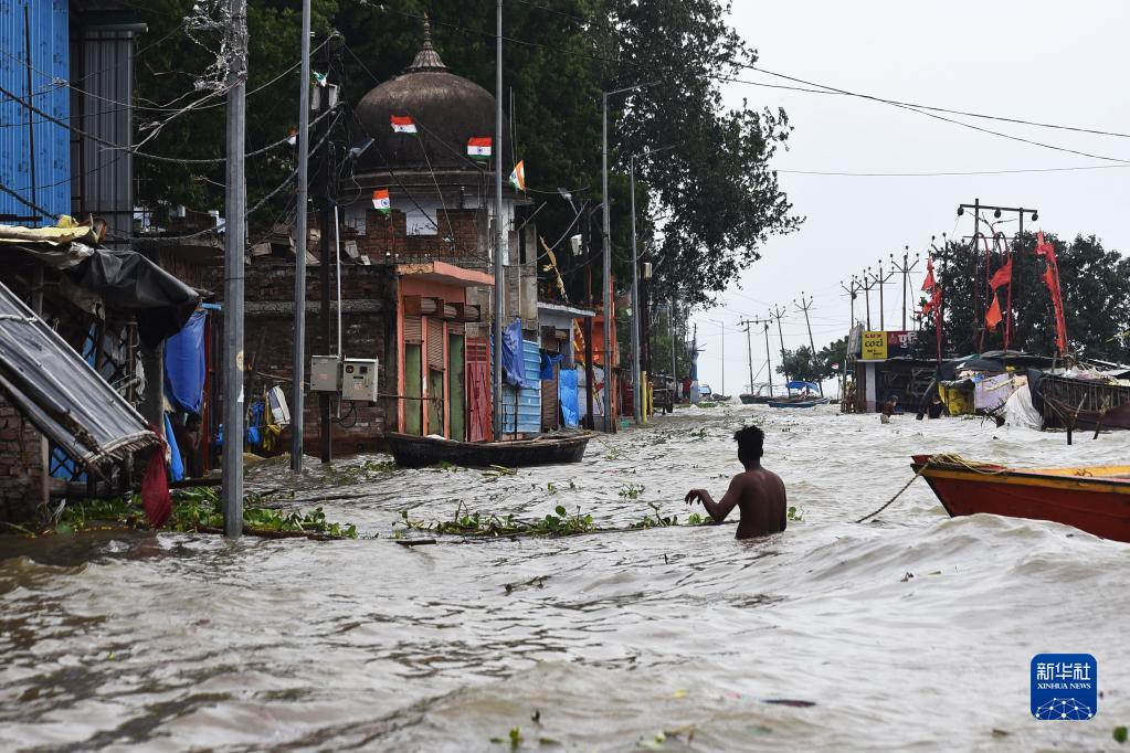 8月21日,在印度北方邦普拉亞格拉杰,一名船夫在洪水中拉著自己的船。近日,印度北方邦持續(xù)遭洪水侵襲。印度每年6月至9月是季風(fēng)雨季,雷電暴雨天氣頻發(fā),洪水、泥石流、山體滑坡等災(zāi)害經(jīng)常發(fā)生。新華社發(fā)
