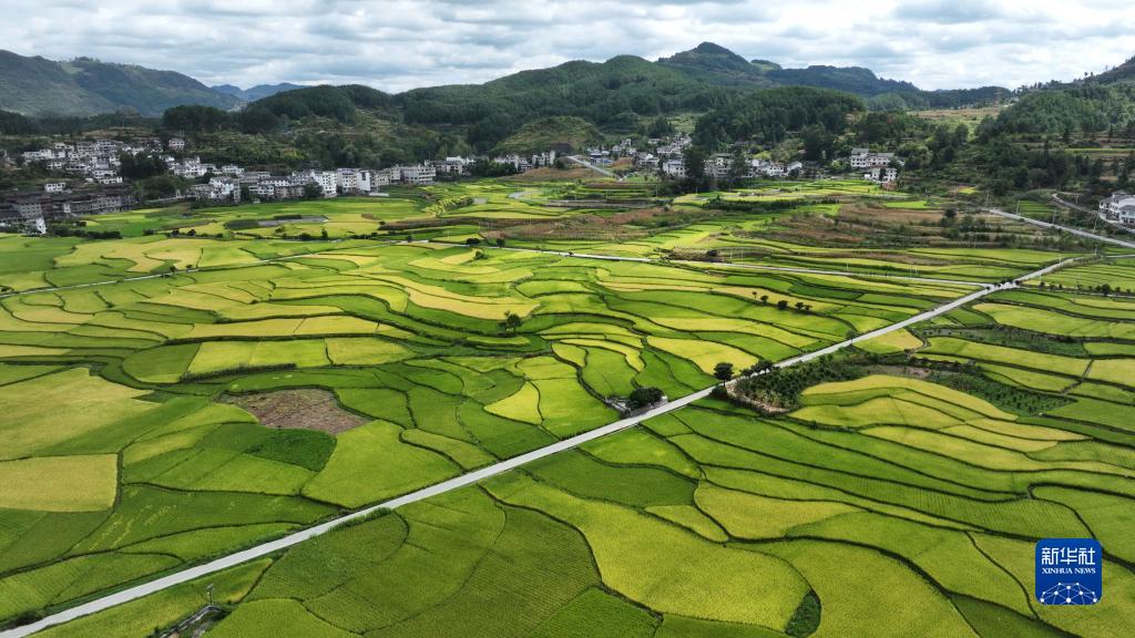初秋,貴州省貴陽市開陽縣禾豐鄉馬頭村近千畝優質稻谷長勢喜人,田園、村莊、河流、鄉村公路組成一幅貴州高原獨特的田園豐收畫卷。