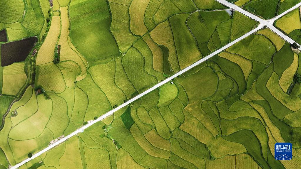 初秋,貴州省貴陽市開陽縣禾豐鄉馬頭村近千畝優質稻谷長勢喜人,田園、村莊、河流、鄉村公路組成一幅貴州高原獨特的田園豐收畫卷。
