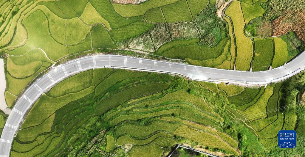 初秋,貴州省貴陽市開陽縣禾豐鄉馬頭村近千畝優質稻谷長勢喜人,田園、村莊、河流、鄉村公路組成一幅貴州高原獨特的田園豐收畫卷。