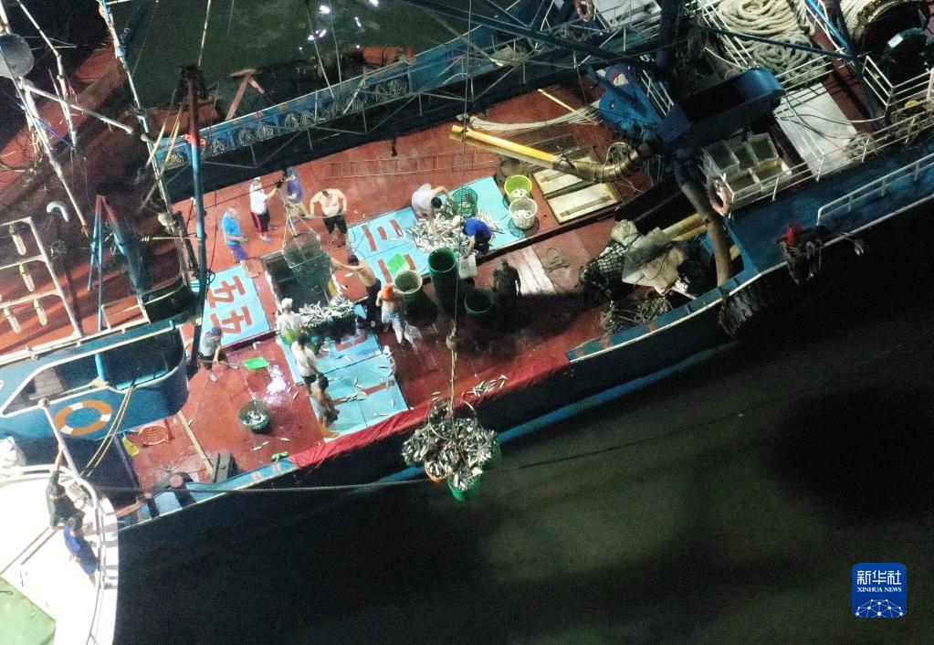 8月26日,漁民在寧德市霞浦縣三沙中心漁港的漁船上卸下漁獲(無人機照片)。