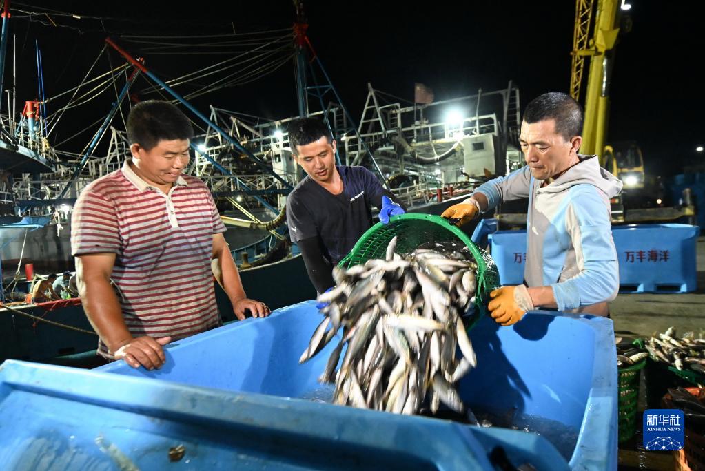 8月26日,工人在寧德市霞浦縣三沙中心漁港的碼頭上分裝漁獲。