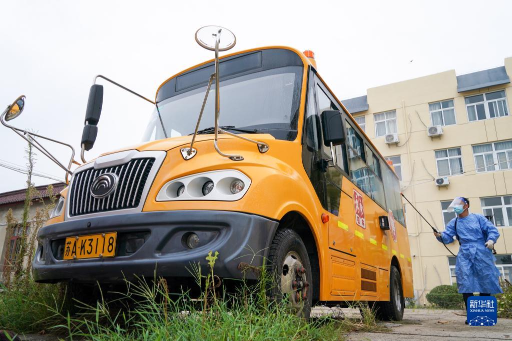 8月27日,工作人員在南京市高淳區固城中學對校車進行消殺。