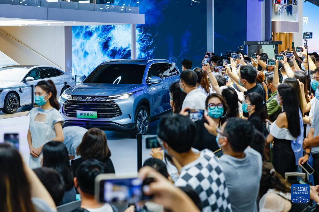 8月26日,在第二十五屆成都國際汽車展覽會的比亞迪汽車展臺,比亞迪超級混動SUV“護衛艦07”首發亮相,吸引眾多觀眾和媒體記者圍觀拍照。