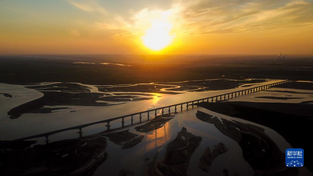 8月16日在內蒙古鄂爾多斯市杭錦旗拍攝的黃河日落景觀(無人機照片)。