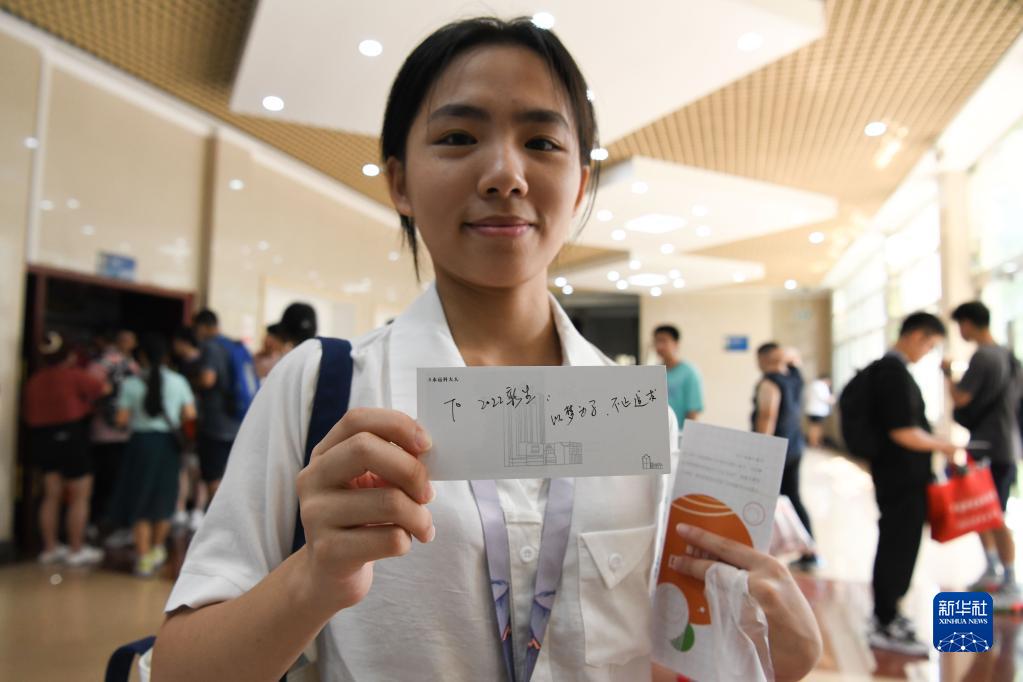 8月21日,中國科學技術(shù)大學2022級本科新生陳燁泓展示寫有學長學姐祝福的明信片。