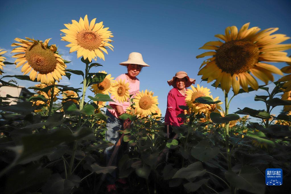 8月23日,河北省遵化市團瓢莊鄉(xiāng)山里各莊村村民在田間管護向日葵。