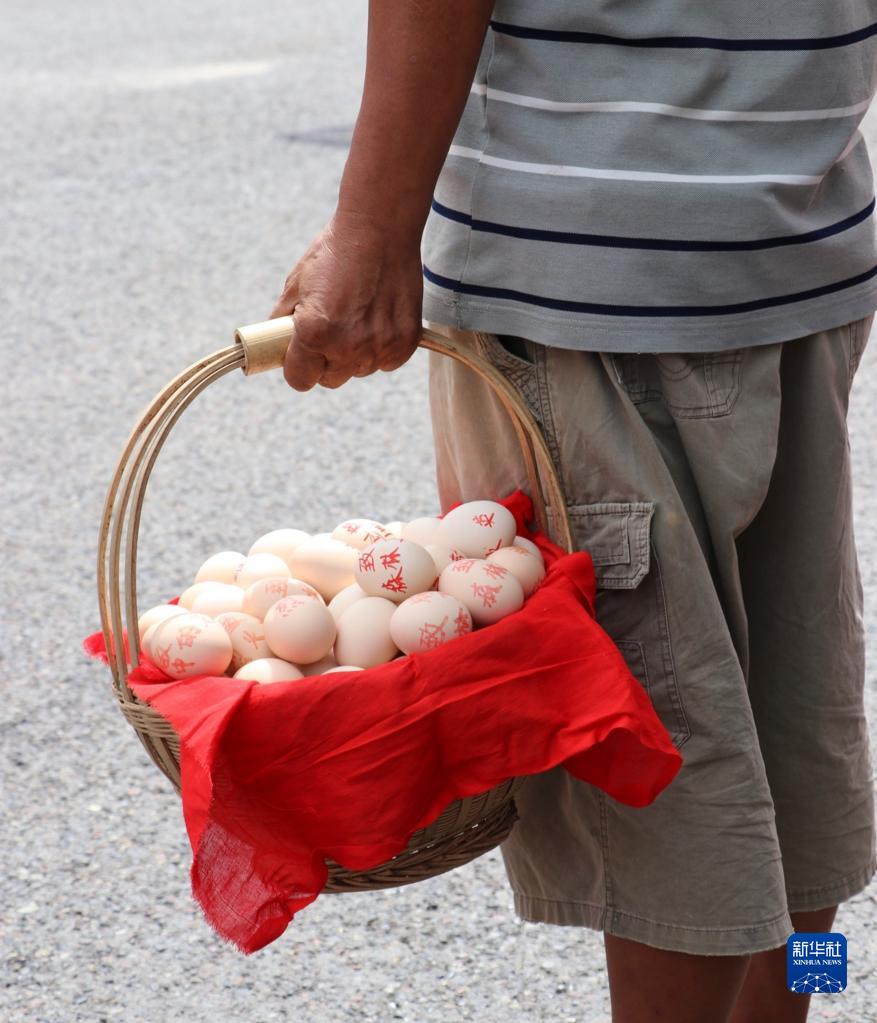8月27日,在重慶市璧山區,村民提著一籃煮雞蛋等候即將離開的森林消防隊員。