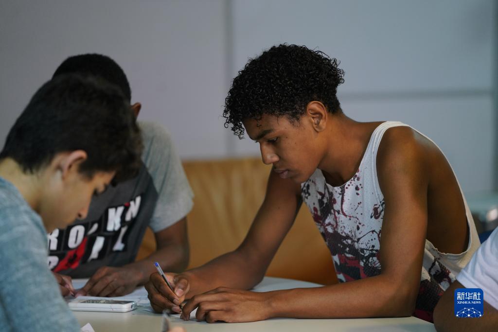 8月25日,在巴西里約熱內盧西區“上帝之城”社區,馬西奧(右)和同學們在“彈奏聲音”教室中上課。新華社記者 王天聰 攝