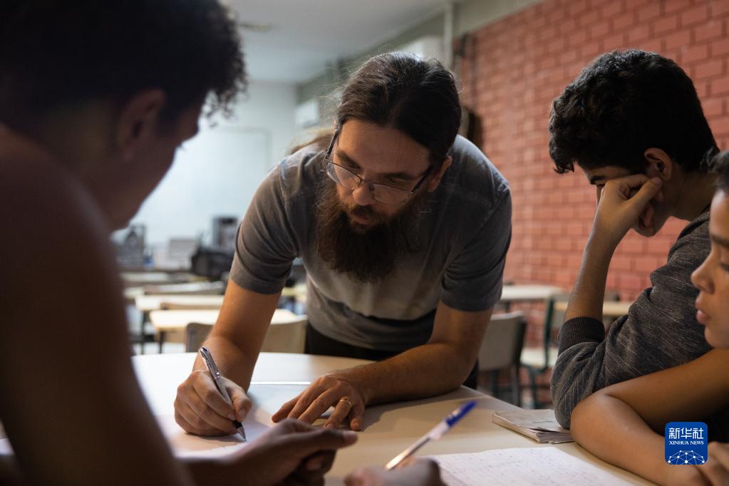 8月25日,安東尼奧(中)在巴西里約熱內(nèi)盧西區(qū)“上帝之城”社區(qū)為學(xué)生們講課。新華社記者 王天聰 攝