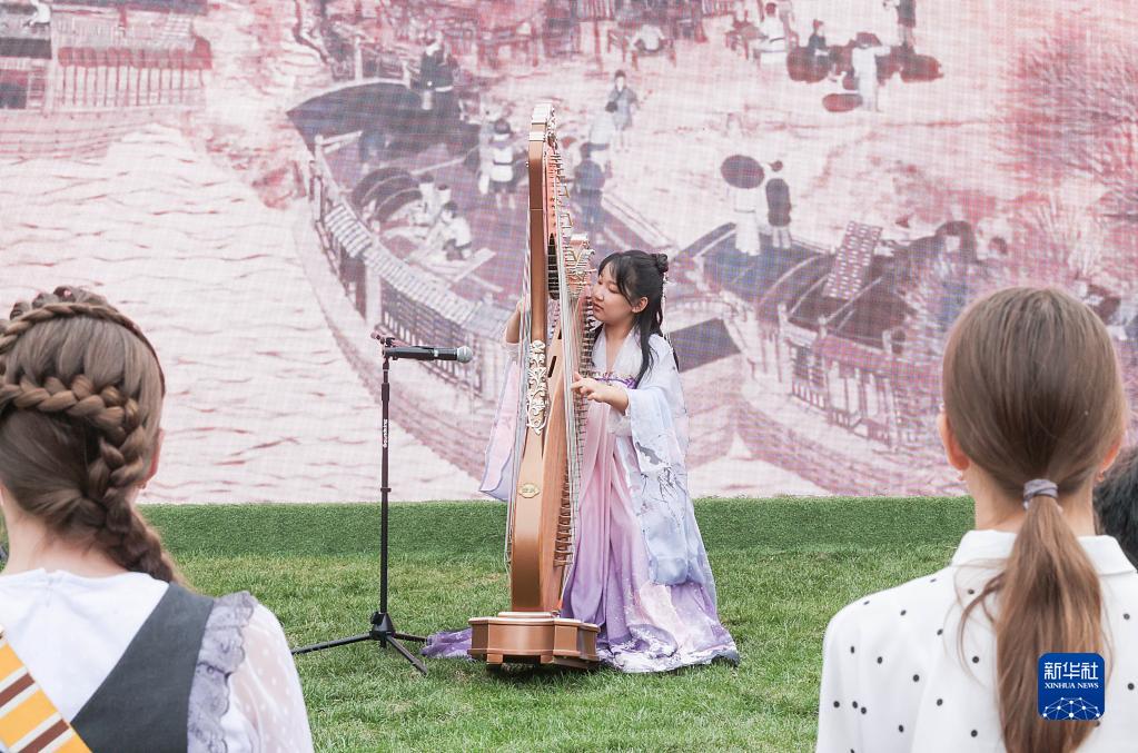 8月27日,小演員在招待會上表演箜篌獨奏《清明上河圖》。