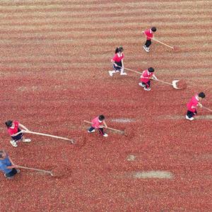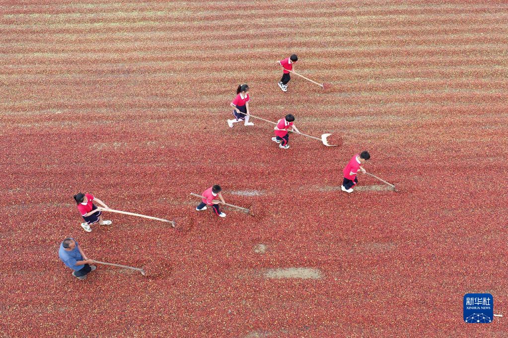 8月27日,河北省邢臺市內(nèi)丘縣柳林鎮(zhèn)明德小學(xué)學(xué)生在體驗(yàn)晾曬酸棗(無人機(jī)照片)。