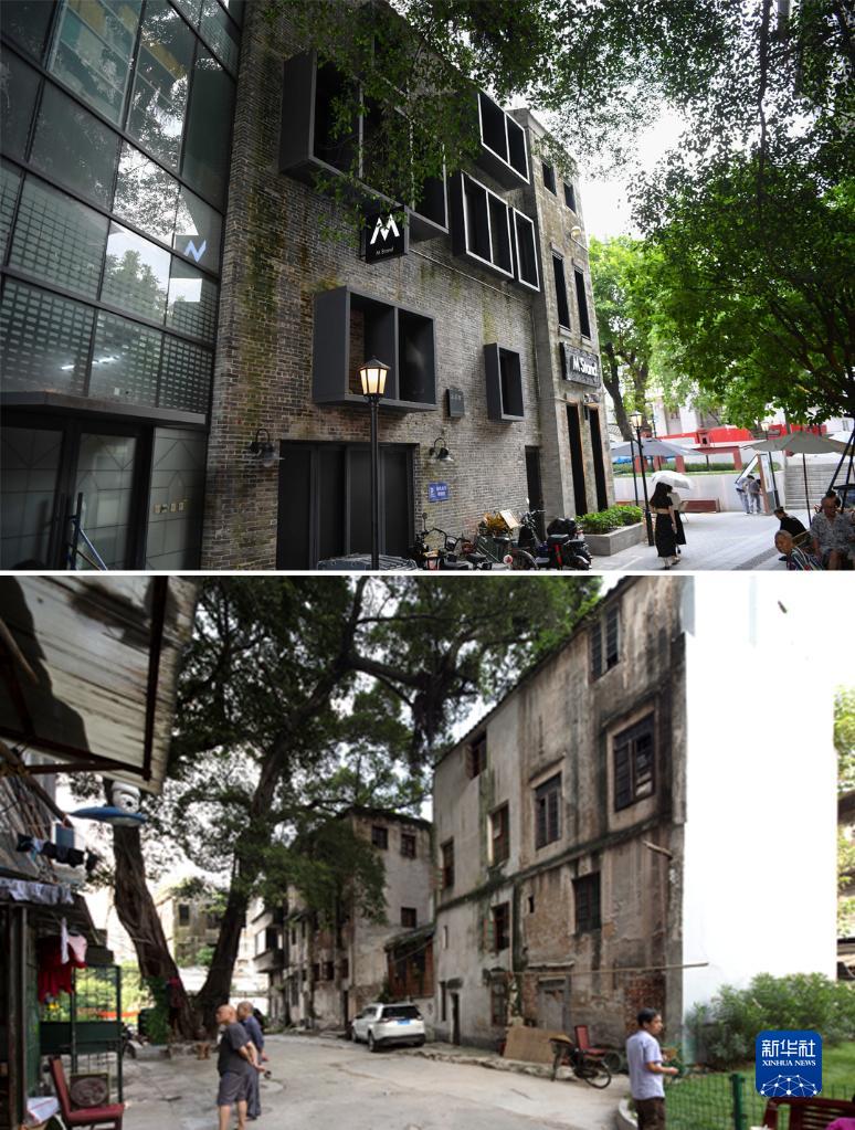 這是一張拼版照片:上圖為2022年7月19日在廣州永慶坊拍攝的一棟建筑(新華社記者 鄧華 攝);下圖為2015年拍攝的同一棟建筑(廣州市荔灣區住房建設和園林局供圖)。
