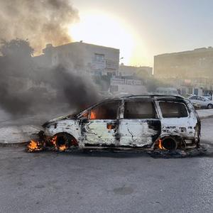 這是8月27日在利比亞首都的黎波里拍攝的損毀的汽車。