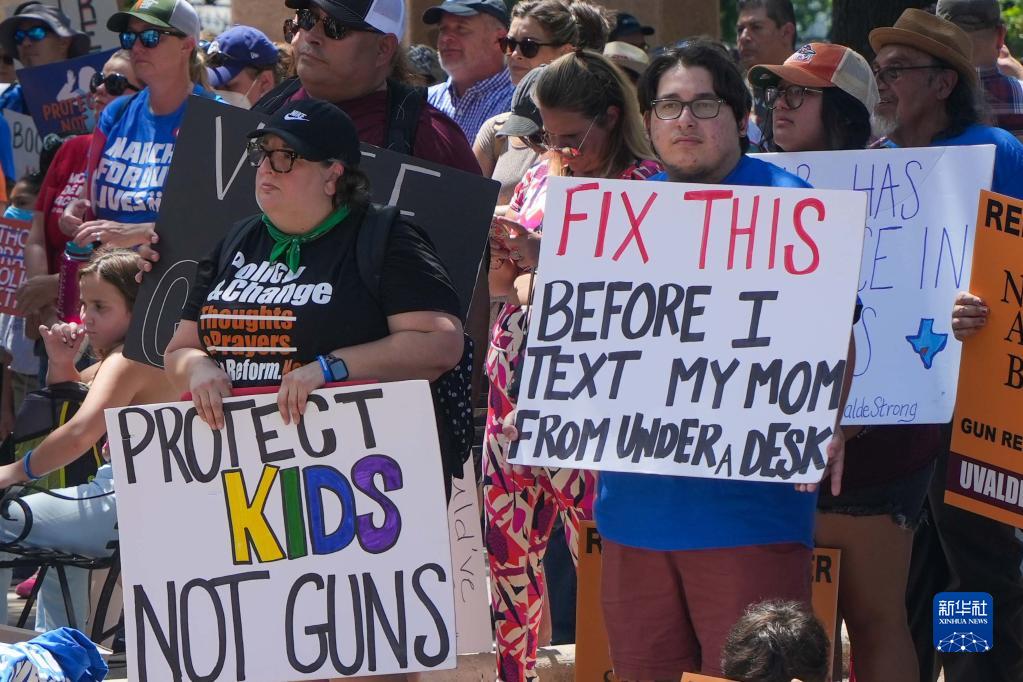 當日,包括得州小學槍擊案遇難者親屬在內的抗議者在奧斯汀市舉行集會呼吁控槍。5月24日發生在得州尤瓦爾迪市羅布小學的槍擊案造成19名小學生和兩名教師死亡,震動全美。