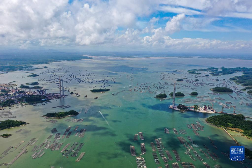 這是8月27日拍攝的平陸運河出海口附近的茅尾海龍門大橋段水域(無人機照片)。