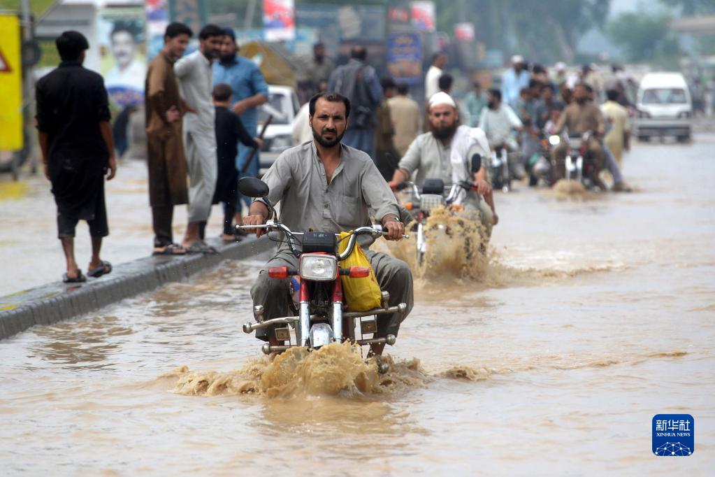 8月27日,人們在巴基斯坦賈爾瑟達涉水出行。