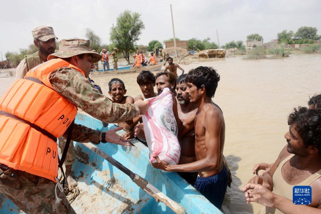 8月27日,在巴基斯坦拉金布爾,巴基斯坦軍人向受災民眾發放物資。