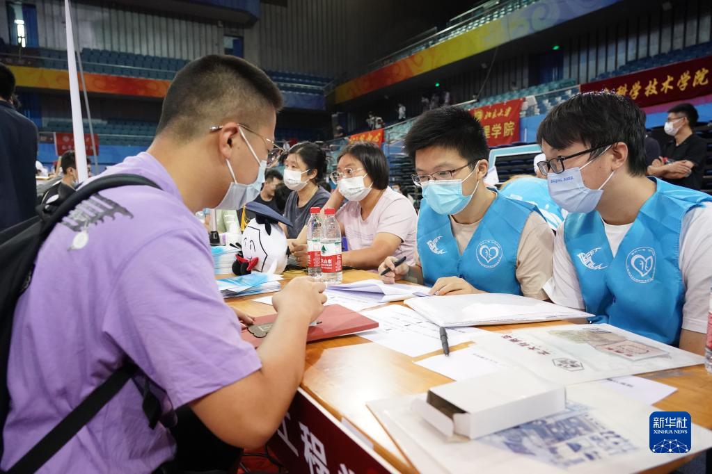 8月28日,在北京大學(xué)邱德拔體育館,一名北京大學(xué)化學(xué)與分子工程學(xué)院2022級(jí)本科新生(左一)在報(bào)到。