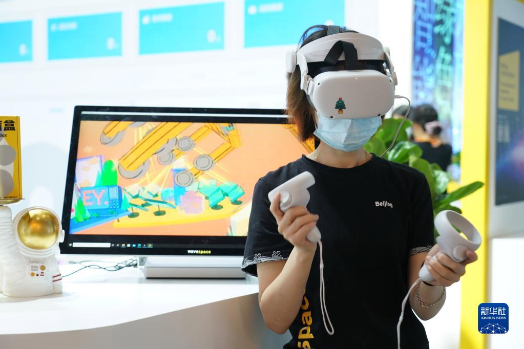 8月28日,在國家會議中心一期,2022年服貿會一家展臺的工作人員通過VR設備進行沉浸式元宇宙協作繪畫演示。
