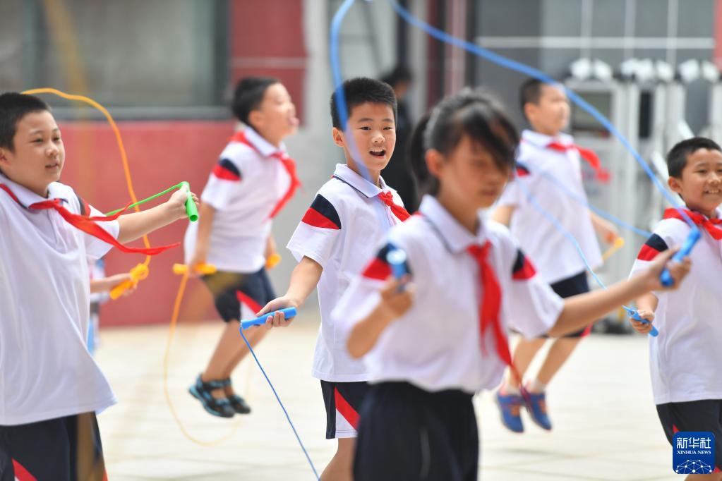 8月29日,在長沙市天心區青園南湖小學,學生在體育課上跳繩。