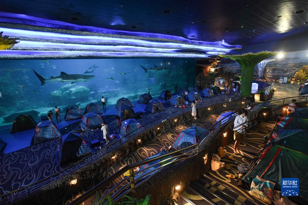 8月27日,體驗者在珠海長隆海洋王國鯨鯊館搭帳篷夜宿,在鯨鯊保育專家的科普中增長知識,近距離體驗與鯨鯊等海洋生物同眠的奇妙之夜,感受人與自然和諧相處,傳遞生態(tài)保護理念。