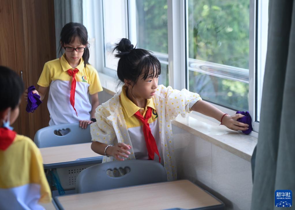 8月29日,龍泉小學的學生在打掃教室,開啟新學期“開學第一課”。