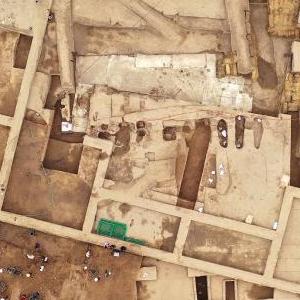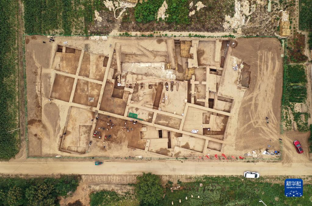 俯瞰南佐遺址核心區大型宮殿建筑發掘現場(8月23日攝,無人機照片)。