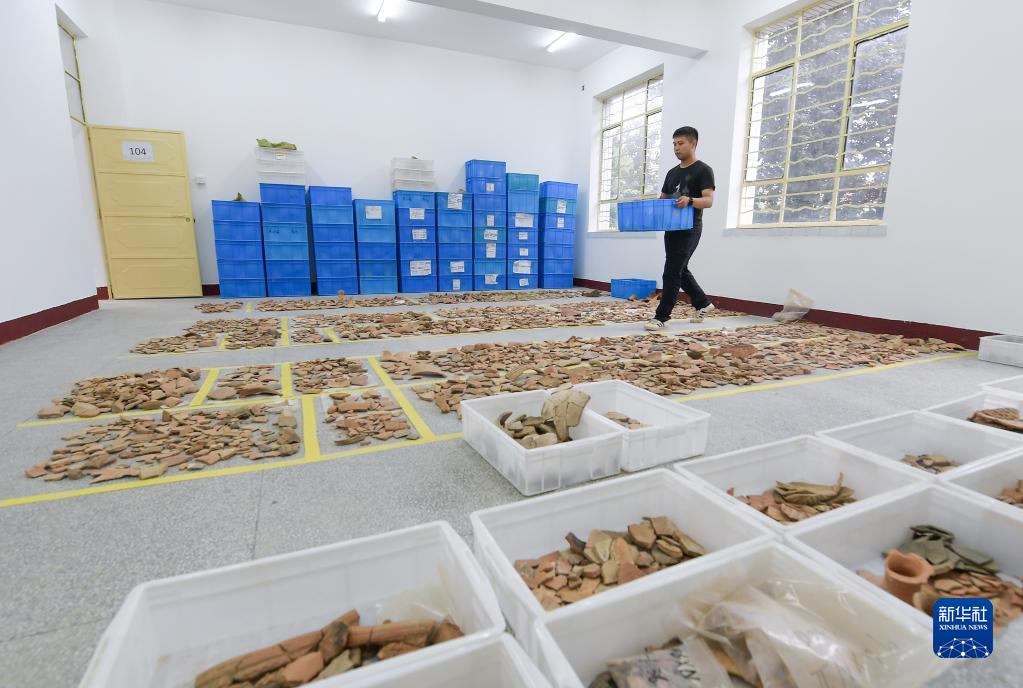 考古工作人員在南佐遺址研究基地整理出土的大量陶片(8月25日攝)。