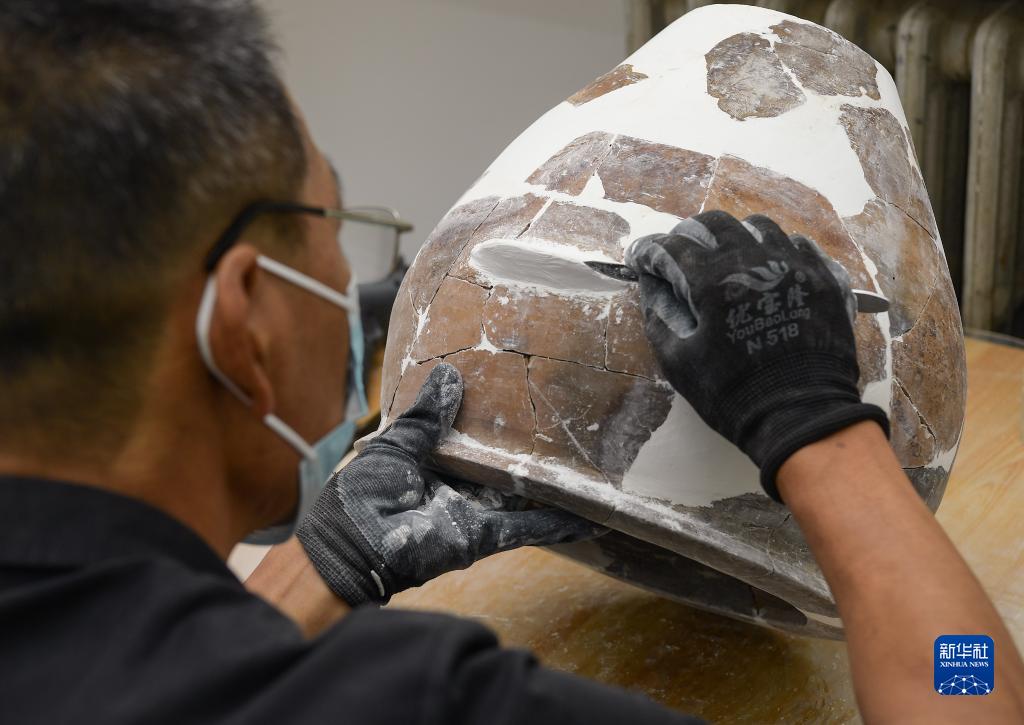文物工作者對南佐遺址內(nèi)出土的陶器進行修復(8月25日攝)。