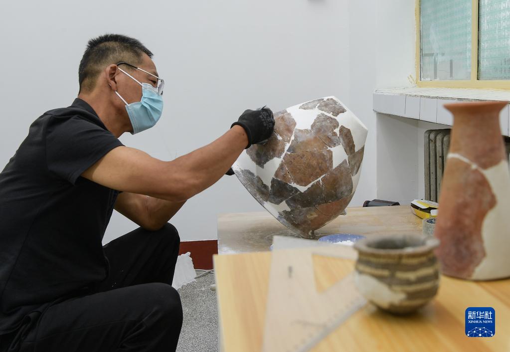文物工作者對南佐遺址內出土的陶器進行修復(8月25日攝)。