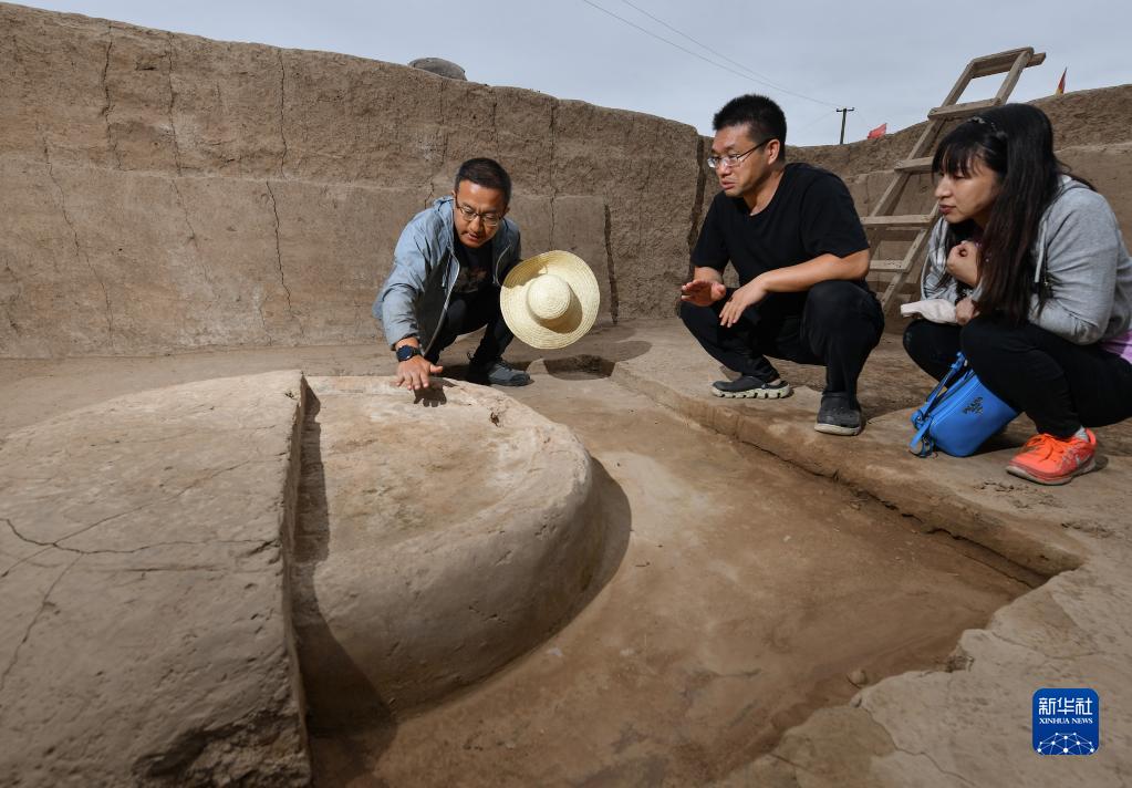 來自西北工業大學文化遺產研究院的考古隊員(左一)在南佐遺址核心區大型宮殿建筑發掘現場展示以“白灰面”鋪就的灶臺遺跡(8月23日攝)。