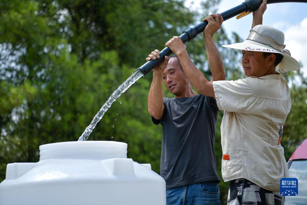 8月25日,在遵義市務(wù)川縣分水鎮(zhèn)天山村,當(dāng)?shù)卣M織村民在抗旱救災(zāi)臨時(shí)集中取水點(diǎn)取水。