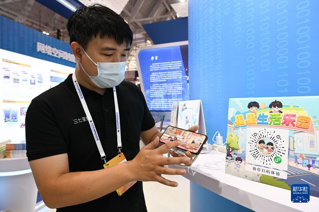 8月28日,在國家會展中心(天津),參展人員在2022年中國網絡文明大會上展示一款為孤獨癥兒童開發的功能性應用軟件。