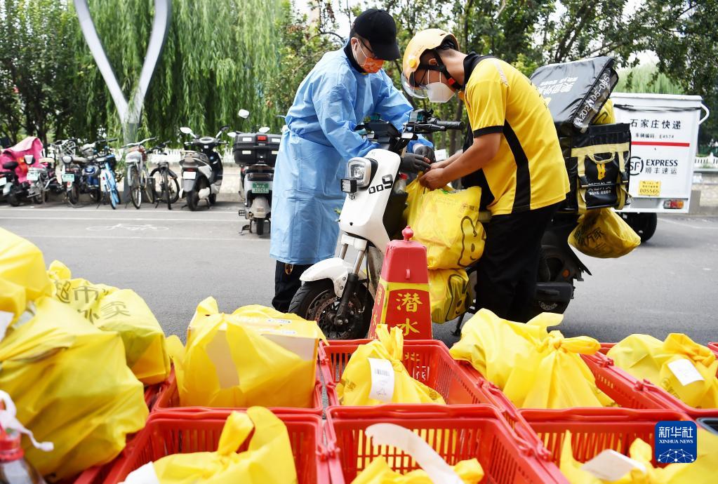 8月30日,在石家莊市裕華區一家超市保供點,外賣人員在打包,準備為市民送貨。