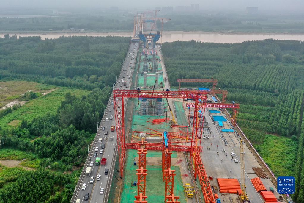 8月30日拍攝的濟南黃河公路大橋擴建工程施工現場(無人機照片)。