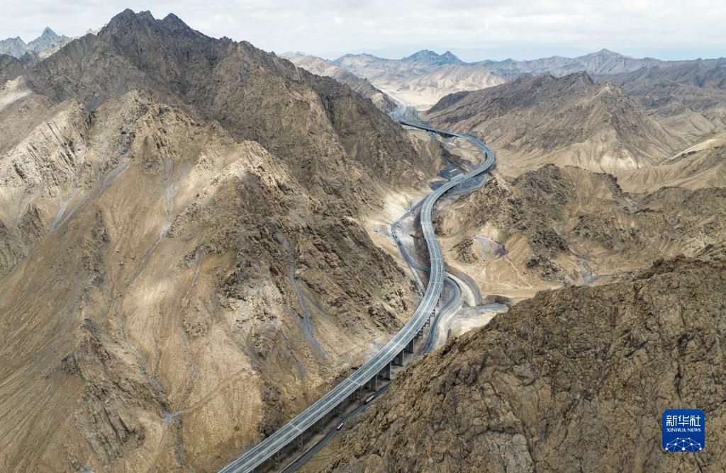 依若高速公路蜿蜒穿越新疆若羌縣山區(qū)(8月6日攝,無人機(jī)照片)。
