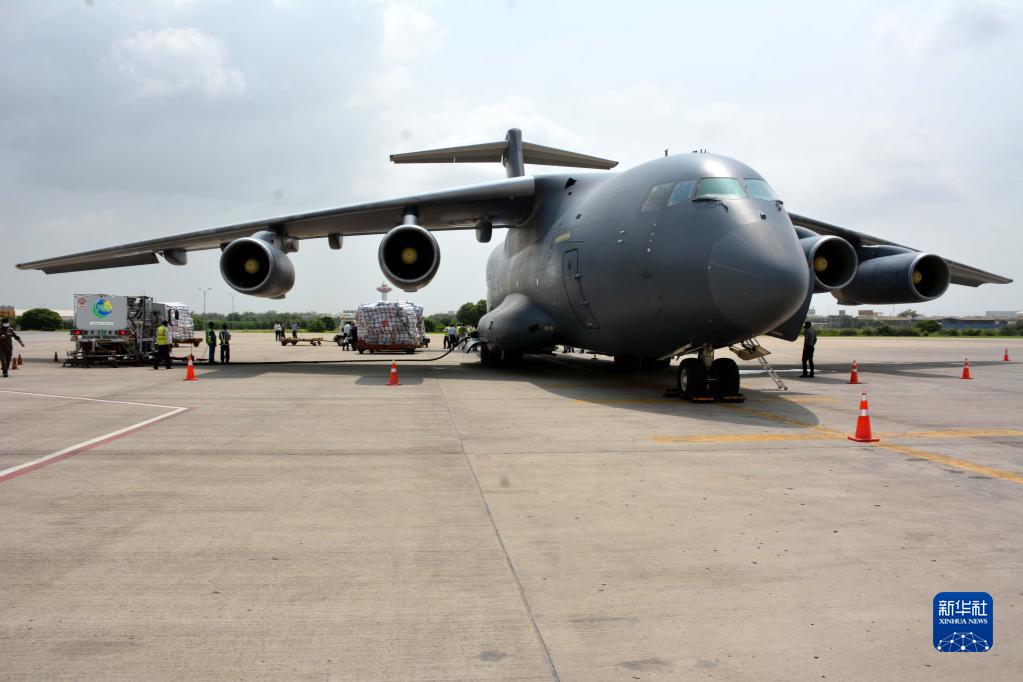 8月30日,載有中國援巴抗洪救災人道主義物資的中國空軍運-20運輸機停靠在巴基斯坦南部城市卡拉奇。