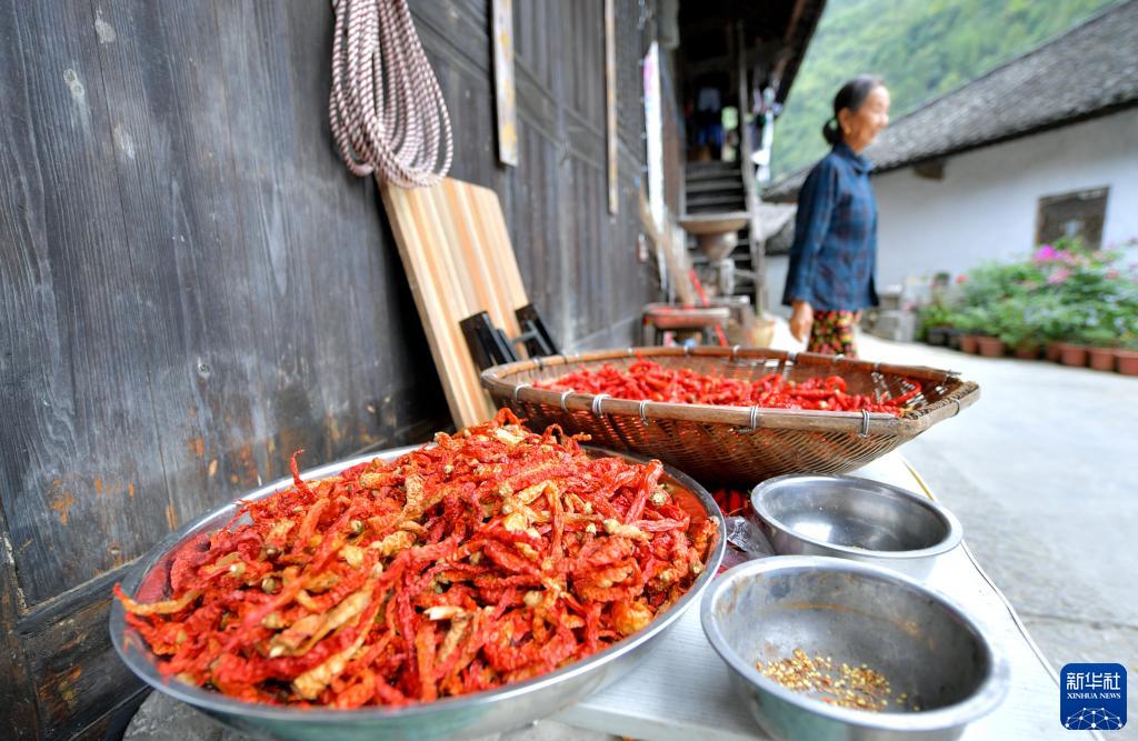 這是8月31日拍攝的彭家寨居民晾曬的辣椒。
