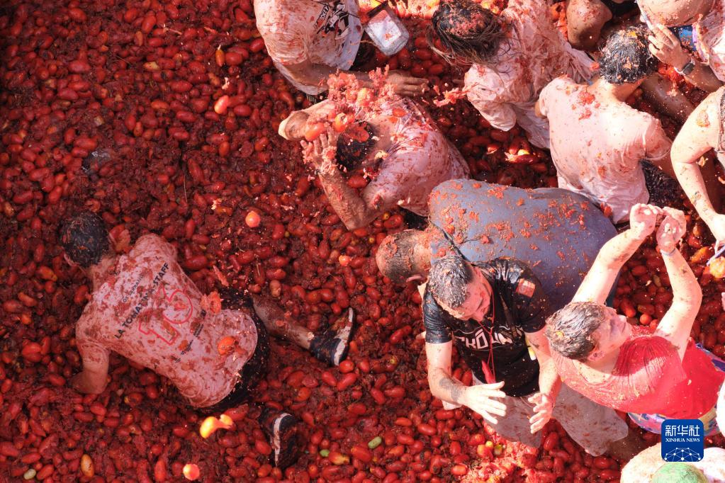 8月31日,在西班牙布尼奧爾舉行的“西紅柿節(jié)”上,人們參加“西紅柿大戰(zhàn)”。