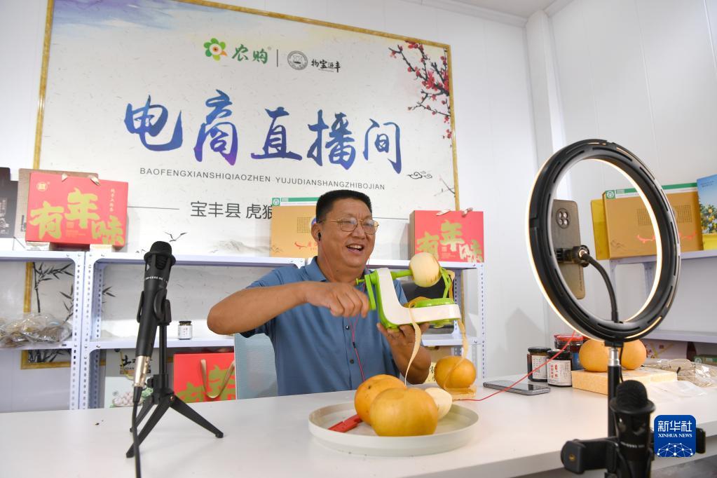8月31日,寶豐縣欣榮種植專業合作社的社員在直播間展示收獲的梨果產品。