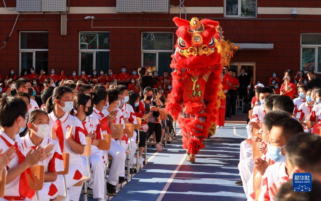 9月1日,中國人民大學附屬中學分校的師生在開學典禮上進行舞獅舞龍表演。