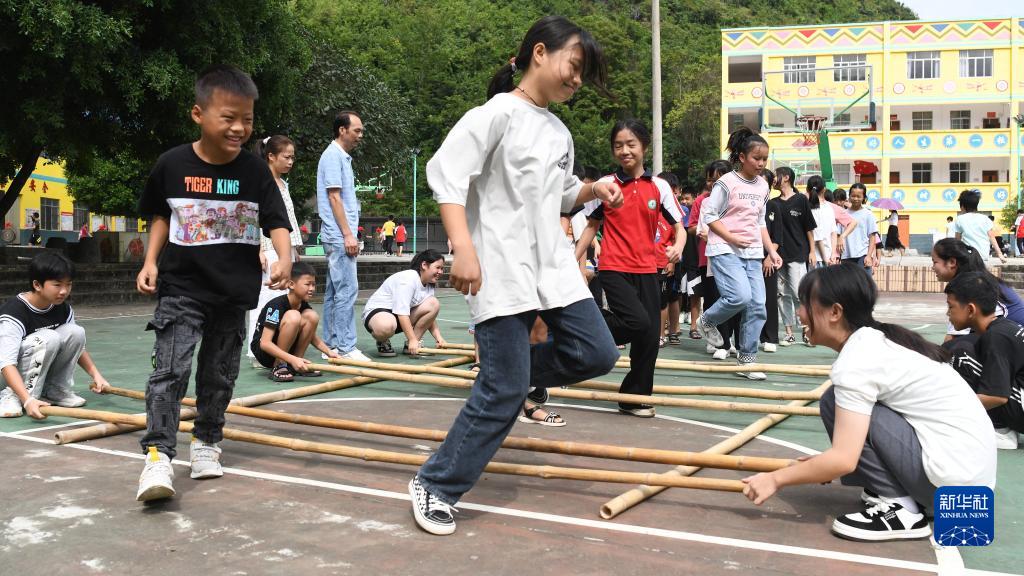 9月1日,廣西大化瑤族自治縣六也鄉(xiāng)六也中心小學(xué)的同學(xué)們在大課間活動中跳竹竿舞,歡慶新學(xué)期開學(xué)。