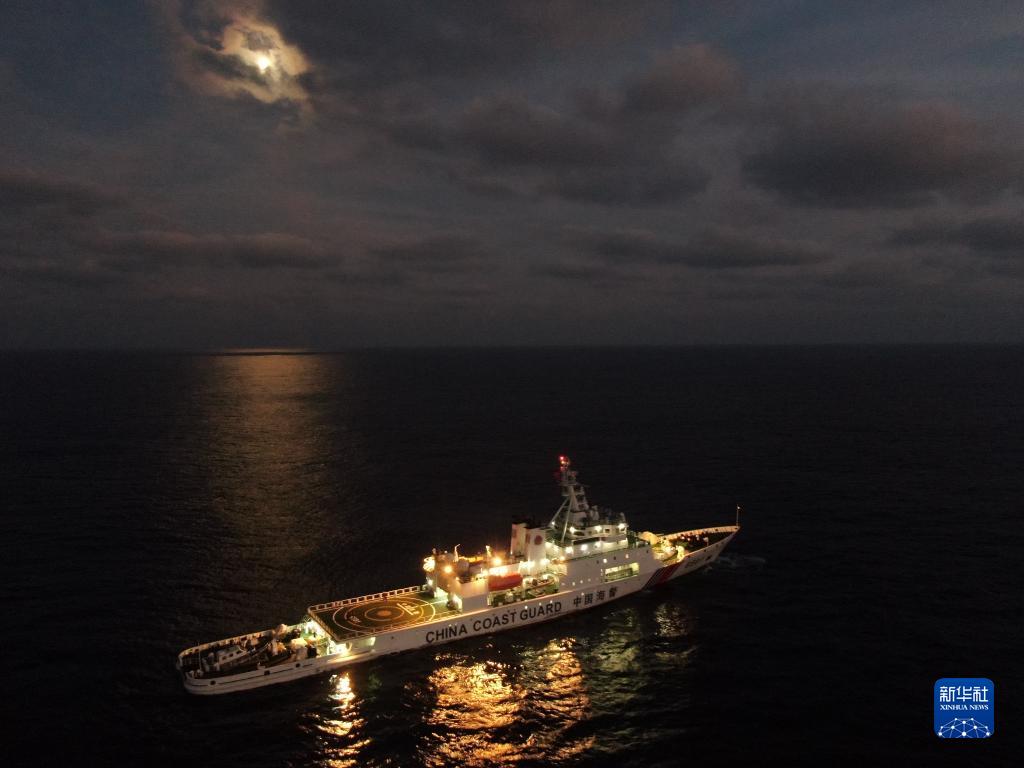 夜幕下在北太平洋公海執(zhí)行巡航任務的長山艦(8月9日攝,無人機照片)。