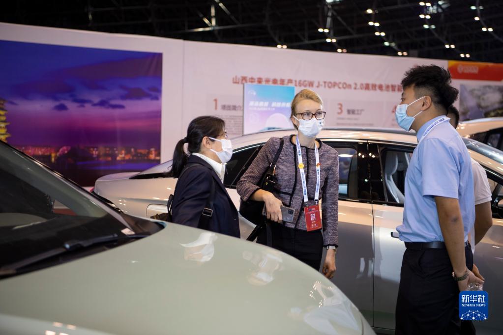 9月1日,參觀者在博覽會上了解一款新能源汽車的情況。